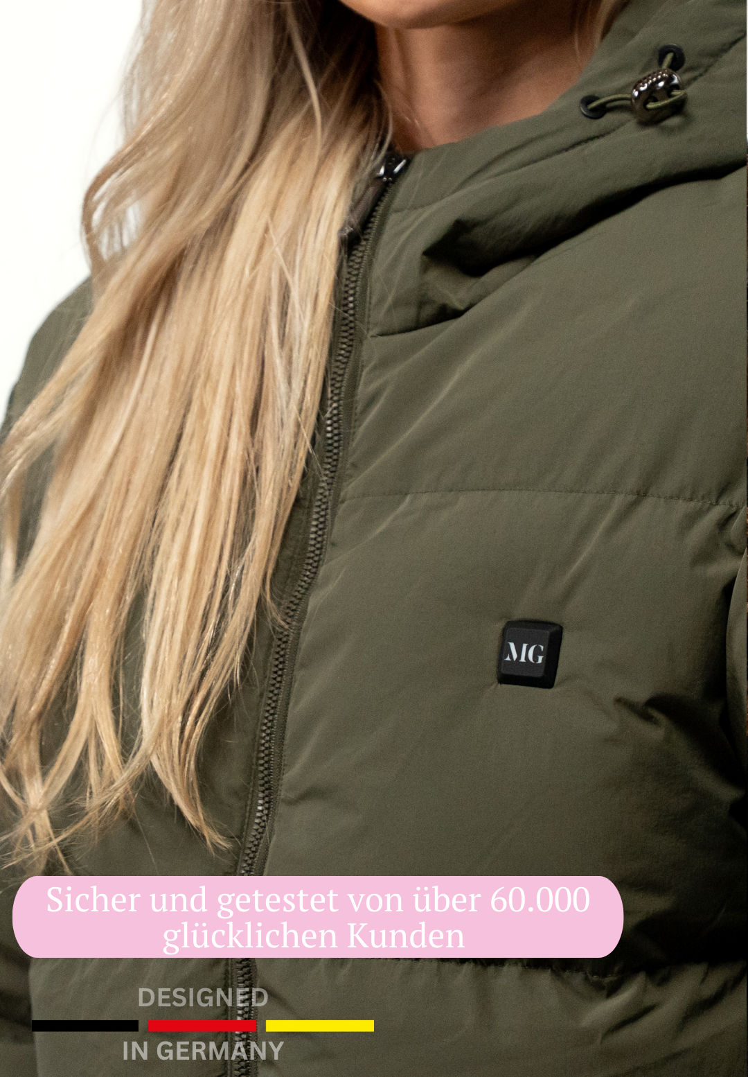Die Jacke ist wasserabweisend, waschbar bei 30 °C und wird mit einer MG Power Bank (Wert 19,90 €) geliefert. Ein Knopfdruck auf das MG Logo genügt – und schon erleben Sie Wärme auf Knopfdruck.